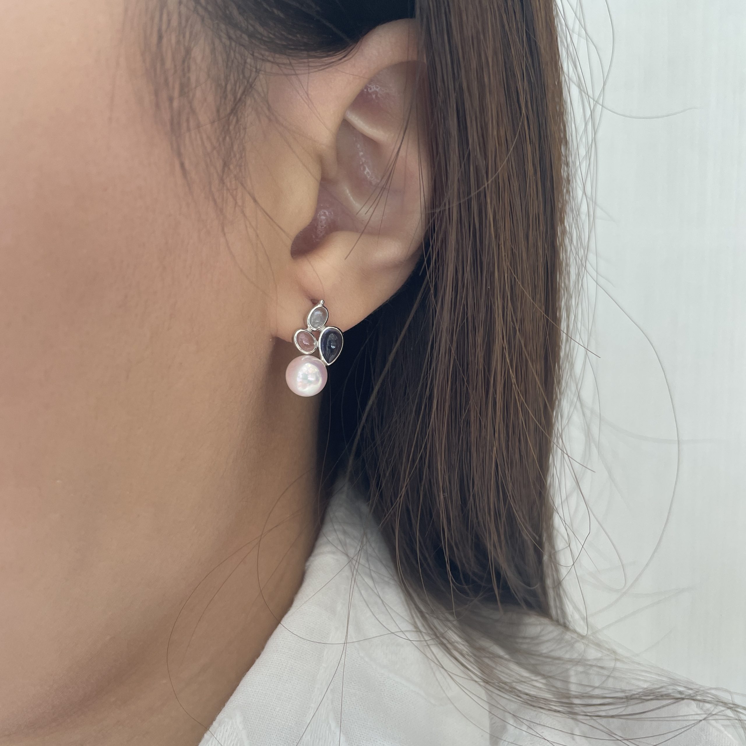 Gemstones earrings featuring 6.5mm white Akoya pearls accented with Coloured Gemstones in K14 white gold. Handcrafted in Ise-Shima, Japan, the birthplace of cultured pearls—timeless luxury with refined movement.