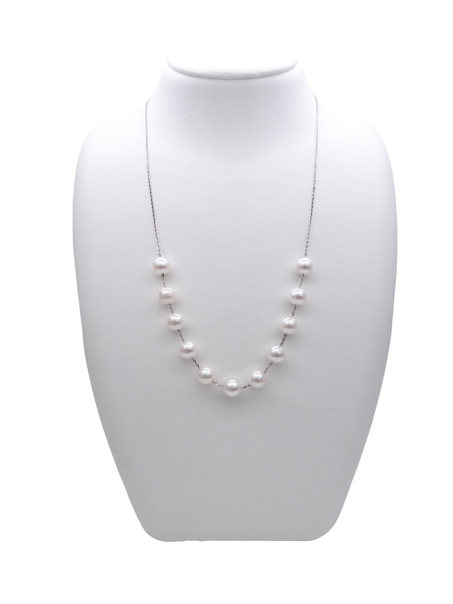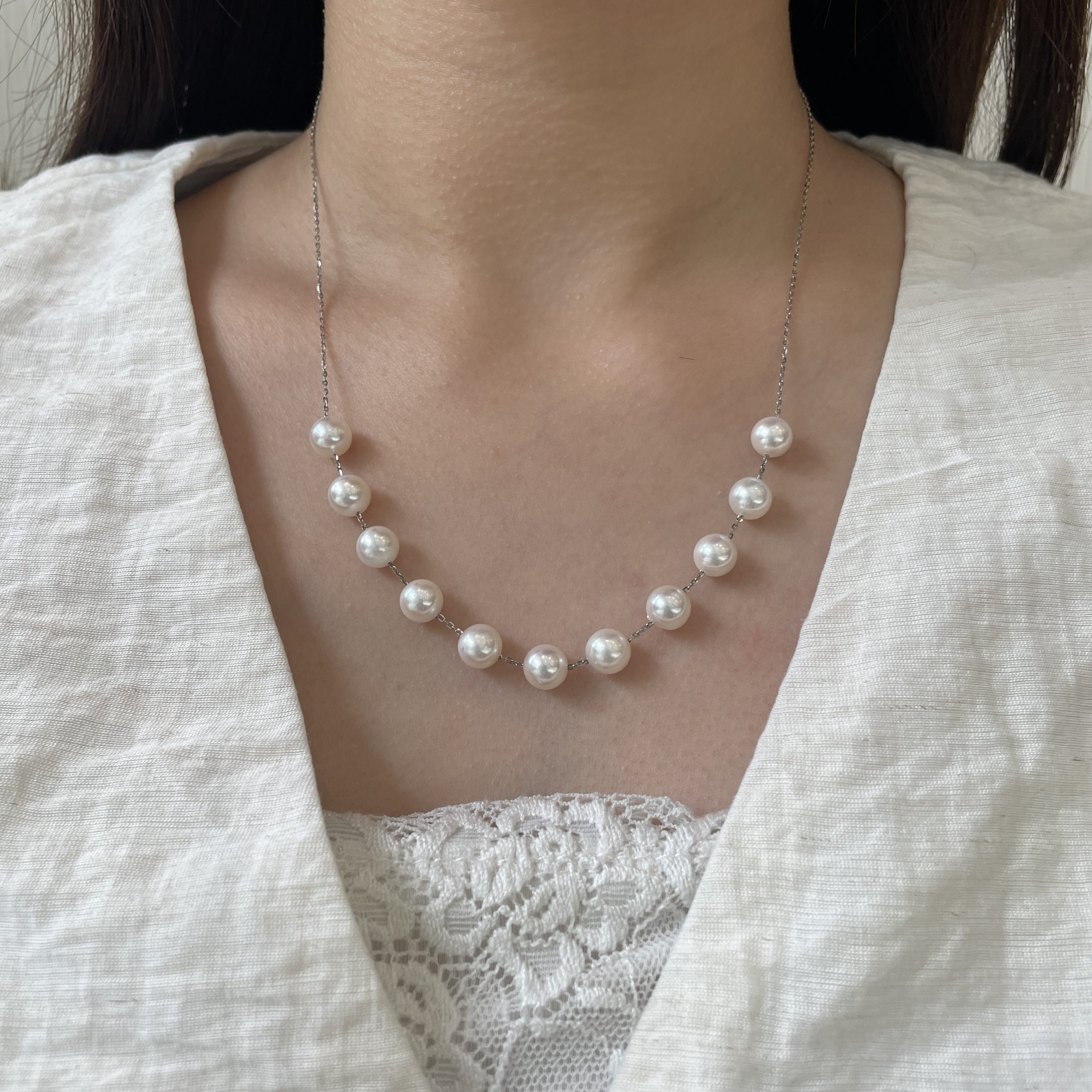 Delicate in weight, rich in lustre. This Akoya pearl lightweight necklace features 11 round white Akoya pearls (7.5mm) set on a 50cm platinum chain, offering timeless elegance for festive and everyday occasions.